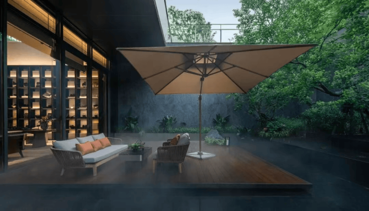 350米风雨连廊(莫比乌斯环设计)串联中央草坪、下沉庭院、雾森景观
