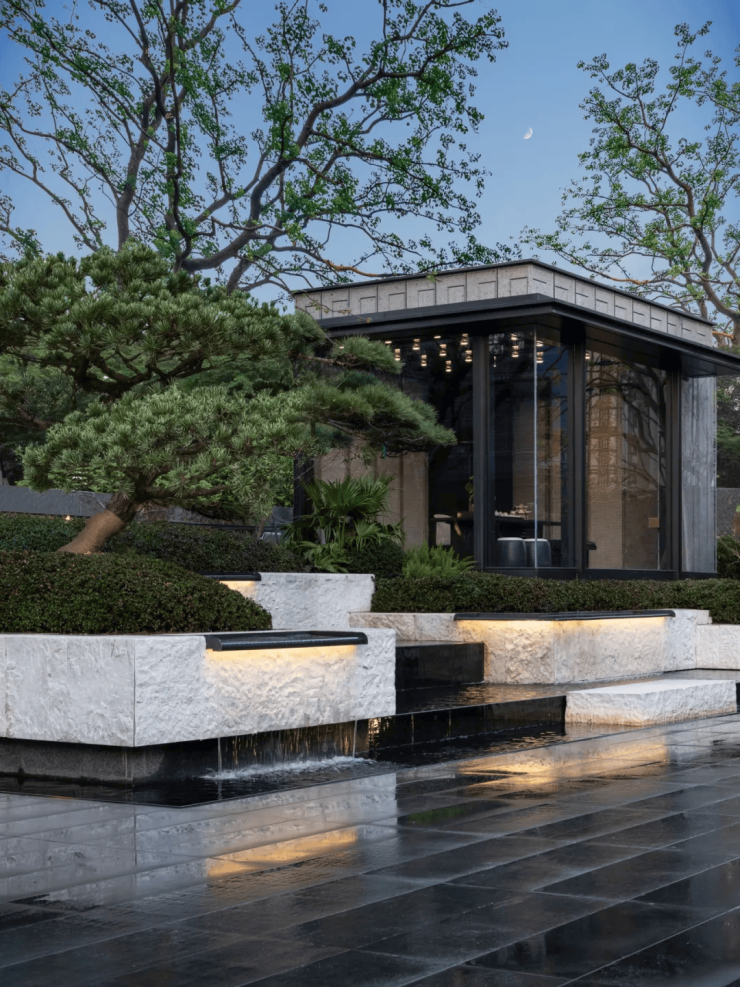 外立面融合宋式美学,铝板+石材+金色框线,打造新中式建筑标杆。