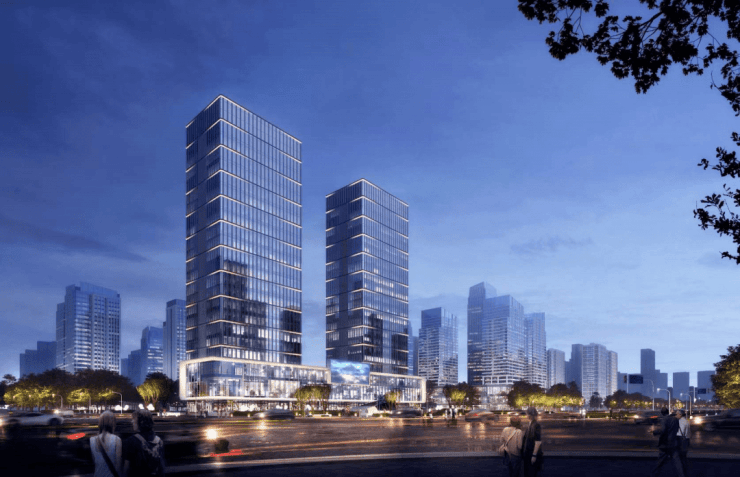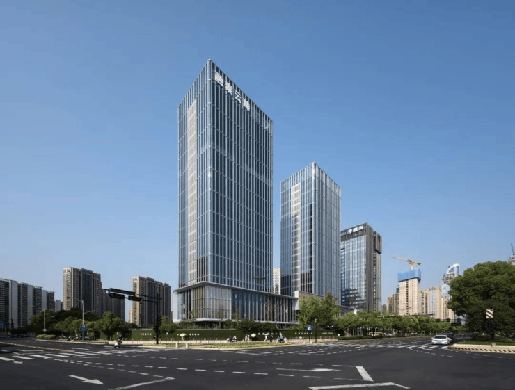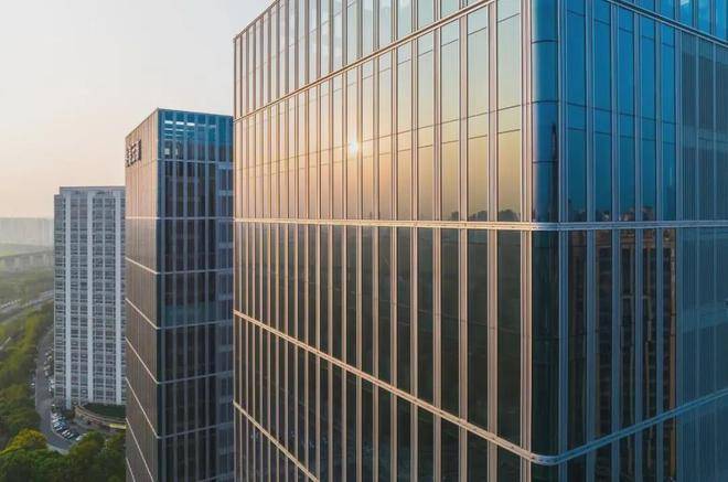 两栋约百米高的双子塔建筑,外立面采用鎏金玻璃幕墙与香槟金铝板组合,以"钱塘潮"为设计灵感,融入"微波-潮涨-惊涛-汐退"四大景观元素