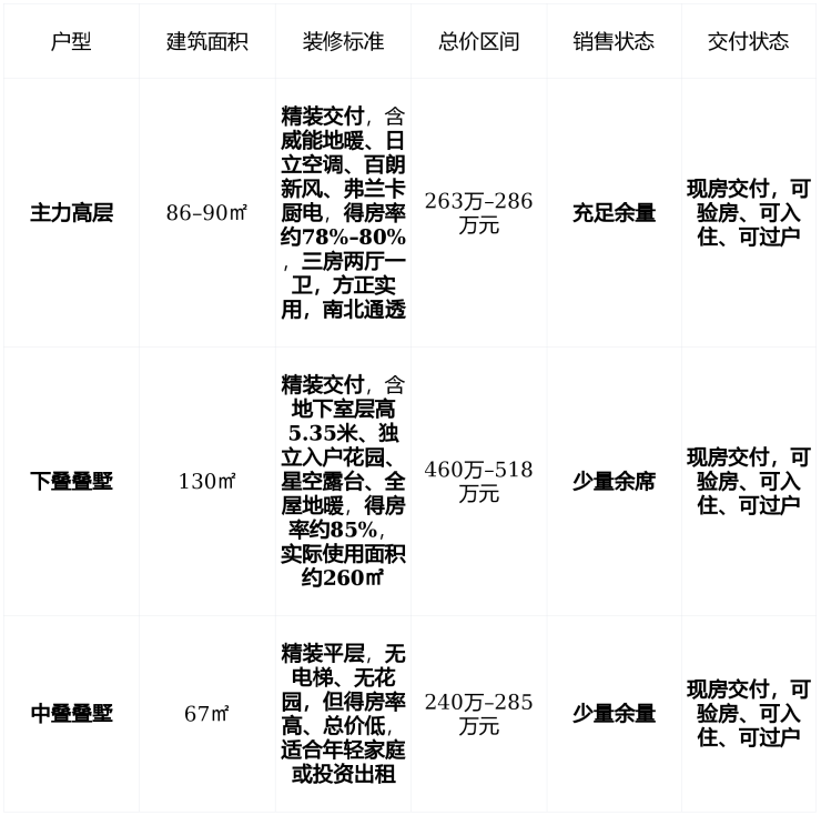 在售状态 : 高层90㎡三房总价263万–286万,叠墅130㎡下叠总价460万–518万,全系精装交付,无摇号、不限购,案场可随时看房验房 。