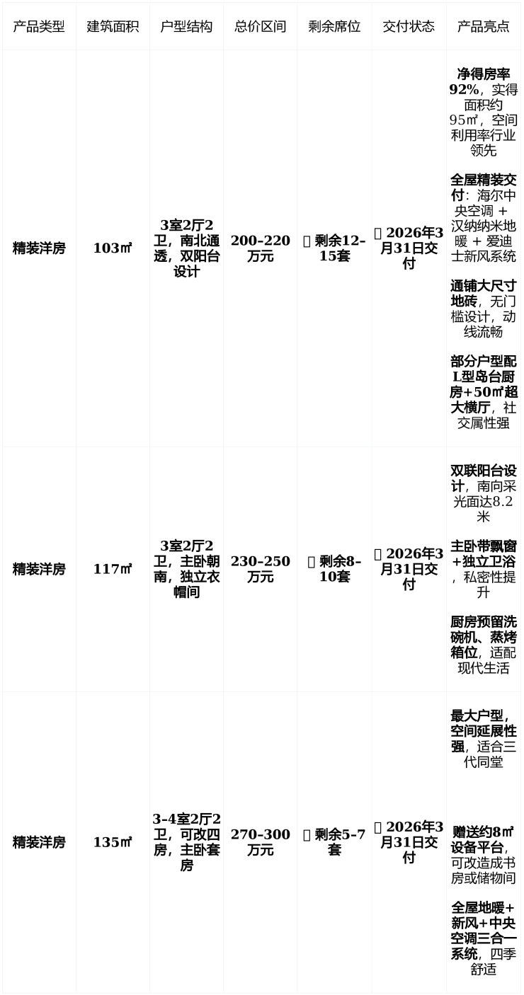 ✅ 核心结论:苏州主城稀缺高得房率改善盘,2026年3月集中交付,103–135㎡精装三房均价2万/㎡,新风+地暖+中央空调全配,对口多所公立名校,无学区房焦虑