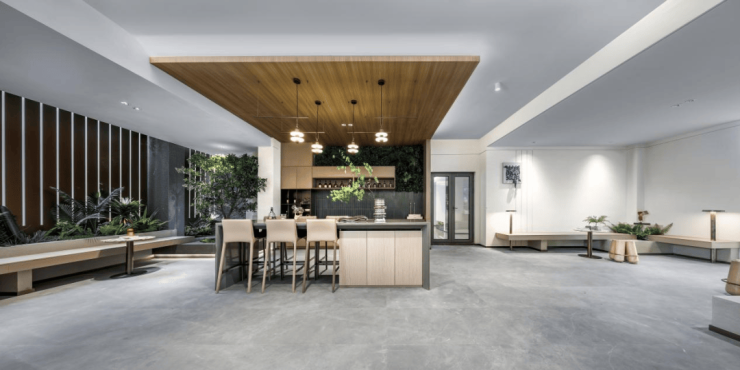 一栋是以中央共享餐吧为主题的架空层,岛台旁布置了吧台、休闲座椅等,十分适合与朋友、邻居开个派对或是举办烘焙沙龙。暖黄的灯光与绿植搭配,温馨又不失格调。