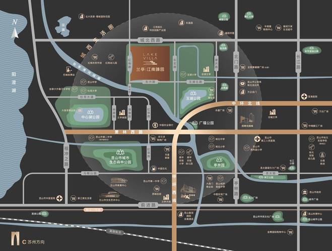 中心湖公园、昆山森林公园、玉湖公园(约970米)三大生态绿境环绕