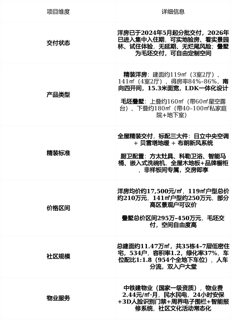 在售状态 : 2024年5月起洋房已分批交付,现房销售,可实地验房拎包入住 , 叠墅为毛坯交付 , 主力产品为119–141㎡精装洋房与160–180㎡毛坯叠墅 , 洋房备案均价约17,000–18,000元/㎡,总价190万–290万元 , 为苏州高铁新城板块稀缺“低密现房+宋锦园林+央企品质”改善型社区 。
