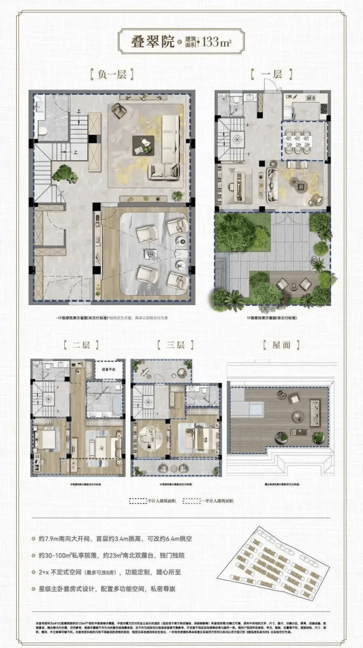 133㎡ 联排院墅 268万元 268万–349万元 70年住宅 最高达248% 送30–100㎡私家庭院 + 南北双露台,“2+X”灵动空间可改8室,首层挑空3.4米