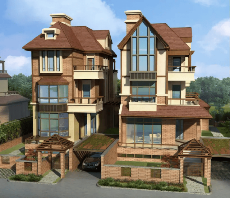 项目建筑风格融合法式经典与英伦优雅,红墙褐瓦、坡屋顶、铝板玻璃幕立面,兼具艺术感与耐久性,为园区罕见的高完成度现房别墅作品。
