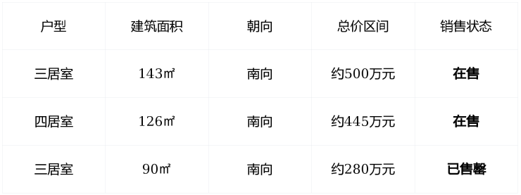 在售户型 :仅剩 143㎡三居室(约500万)126㎡四居室(约445万) ,单价约 36,627元/㎡ ,其余户型已售罄。