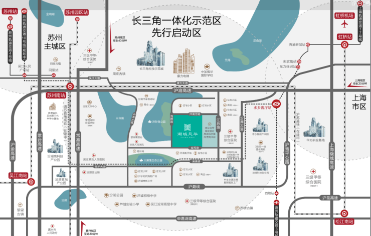 距在建 苏州南站 约7公里,未来沪苏湖高铁通车后, 20min直达上海虹桥