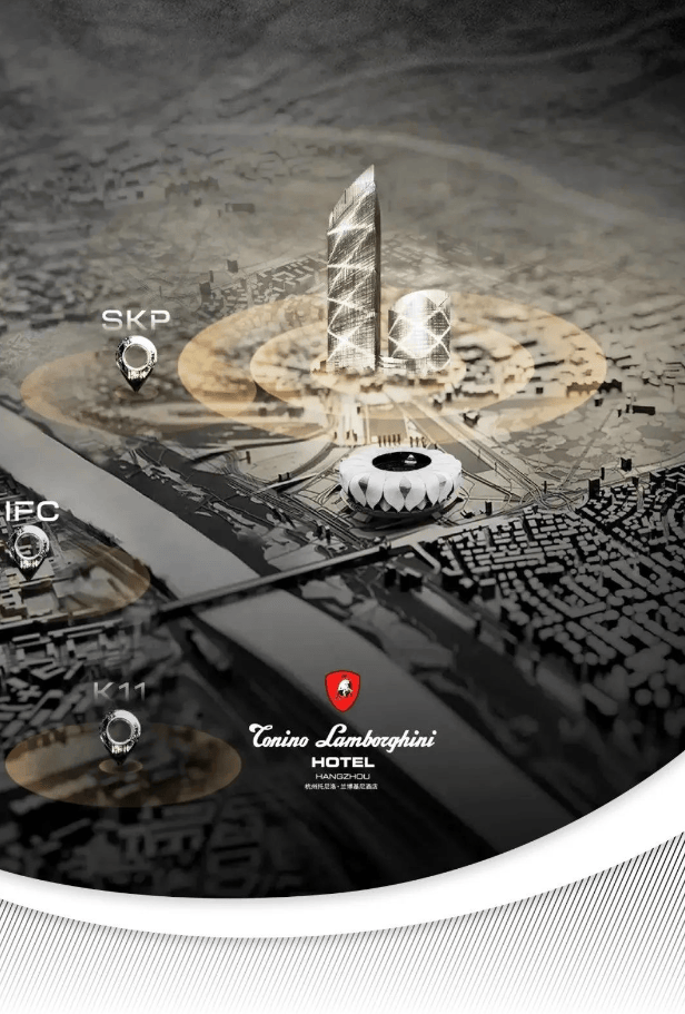 【建筑规划】:T1、T2为250米双塔楼(60层,T1、T2酒店服务奢邸)T3裙楼(12 层,杭州托尼洛·兰博基尼酒店)