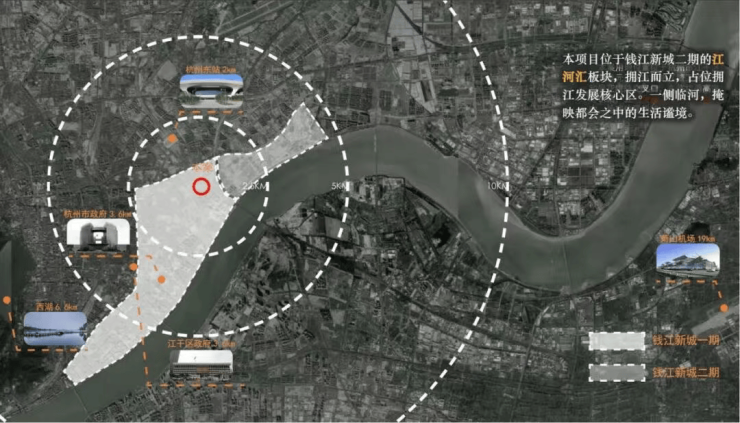 板块定位:坐落于“钱江新城2.0”核心——江河汇,与杭州IFC直线距离约800米,东接亚运村,西瞰钱塘江景,是杭州城市能级跃升的旗舰板块。