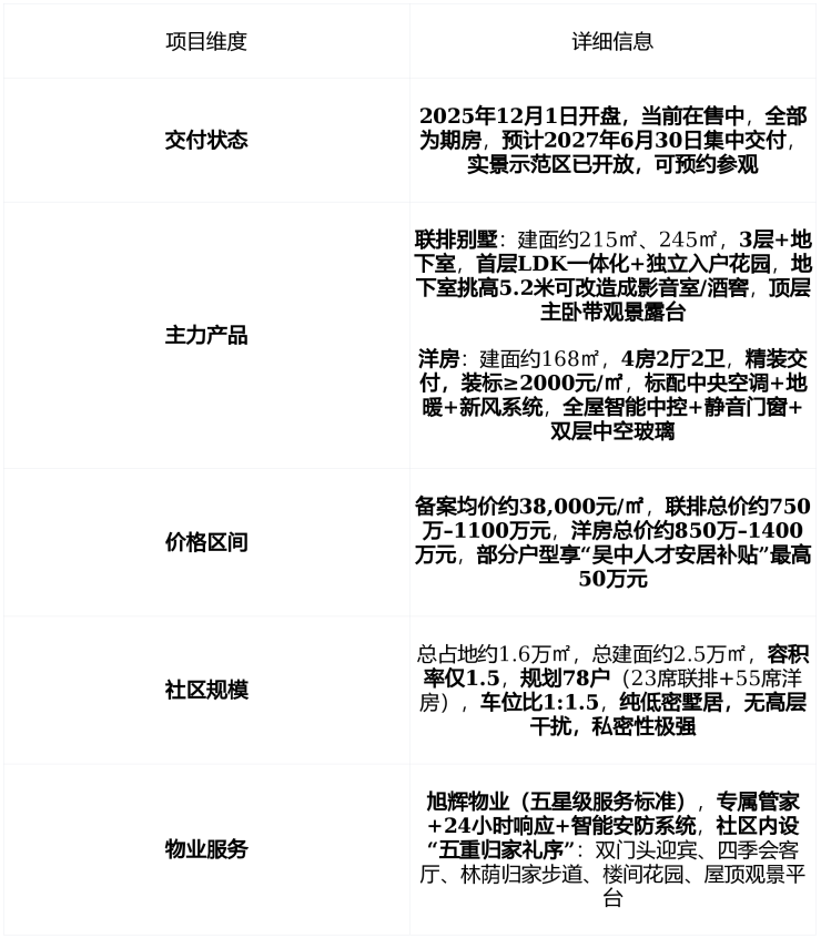 在售状态 : 2025年12月开盘,当前在售中 , 无现房,为毛坯+精装双产品线 ,主力为 联排别墅(215–245㎡) 与 洋房(168㎡大平层) , 备案均价约38,000元/㎡ , 总价区间750万–1400万元 , 总户数仅78席,稀缺性极高 , 2027年6月交付 , 可预约参观实景示范区 。