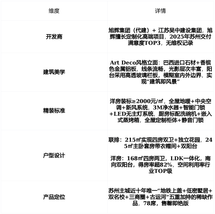 核心优势 : 苏州主城罕见容积率1.5纯墅社区 + 步行150米直达地铁2/3号线“盘蠡路站” + 1公里内覆盖石路、观前、南门三大核心商圈 + 对口姑苏实验学校(振华分校)+胥江实验中学 + 毗邻千年古运河生态廊道 + 旭辉代建+江苏吴中建设双匠联袂 + Art Deco建筑美学+三重园林体系 , 吴中主城近十年唯一“城芯低密墅居” , 未来绝版资产 。