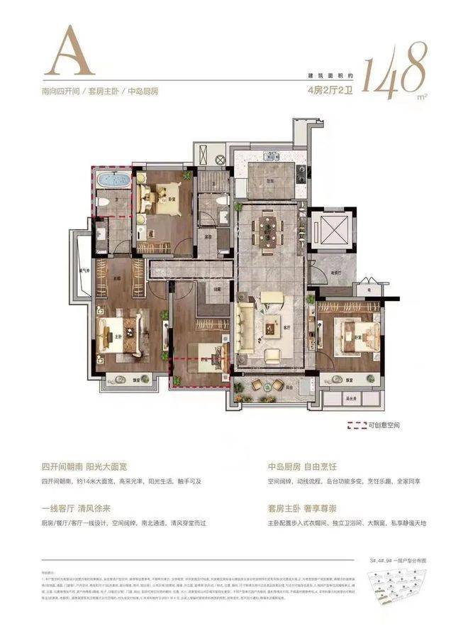 以128m²样板房为例,经典的四叶草格局,避免家庭成员间的相互干扰;