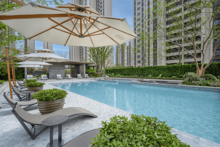 内部设有一个近600㎡的标准泳池和一个儿童戏水池,配合社区多个全龄共享的休闲架空层,使不同年龄段的住户都能在归家途中,快速地找到适合自身的活动空间。