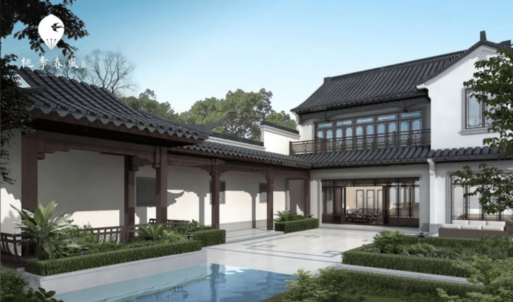 项目采用纯中式徽派建筑风格,粉墙黛瓦,飞檐戗角,由香山帮匠人打造。建筑布局采用"围合式"设计,最大程度保障私密性,同时让每户都能享受景观资源。