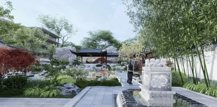 景观设计以江南苏式园林为范本,打造亭台楼阁、小桥流水、叠石理水等景观,形成"八境归家"的递进空间。园林中融入周庄人文元素,将中式仪式感与现代居住需求完美结合。