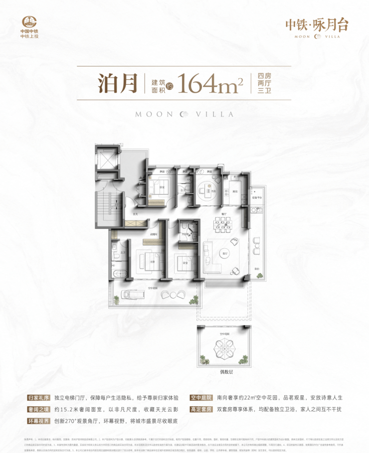 中铁·咏月台创新规划建面约162/164㎡四代洋房,以奇偶层错位的巧妙布局,为每户规划景观露台,实现空中花园的居住梦想。这既是一次对居住形制的革新,更让人与自然达成诗意共鸣。