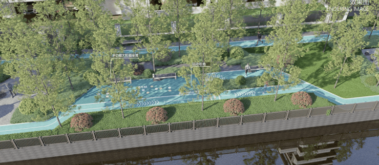 借景古塘河,为业主打造约2600㎡水岸公园,含水杉树阵、绿地草坪、400米跑道及健身设施等