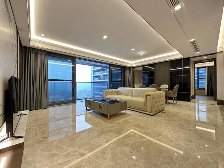 精装大平层,面积段约230-380㎡,层高3.15-3.3米,LDK一体化横厅面宽超10米,270°环幕江景视野
