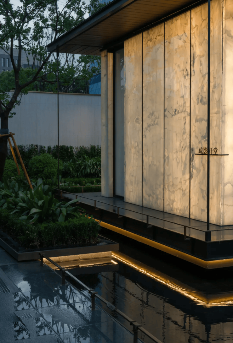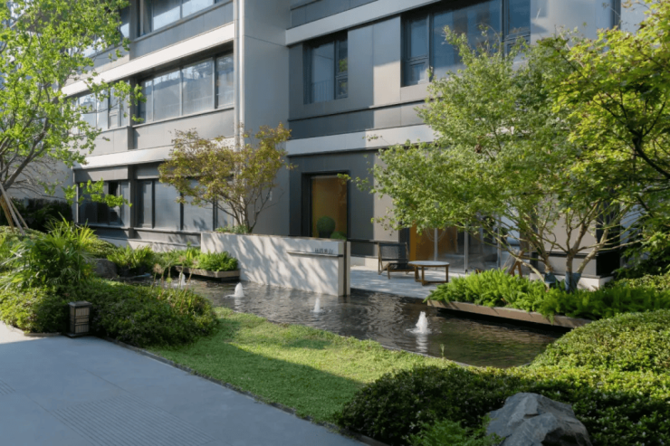 社区内部以“一园三堂”景观礼序打造“五进九雅”的东方居住体验,汲取宋代美学精髓,融合“引、礼、廊、趣、赏、院”六大元素,营造“一步一景”的园林意境 。外部则被亭林公园、森林公园、中心湖公园等环绕,形成“城芯生态圈”,出则繁华,入则宁静 。