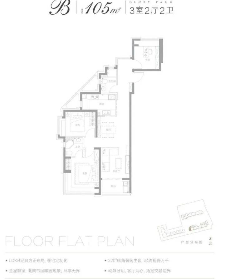 105㎡三房:得房率超82%,类一梯一户设计,客厅连接景观阳台,主卧配备独立卫浴