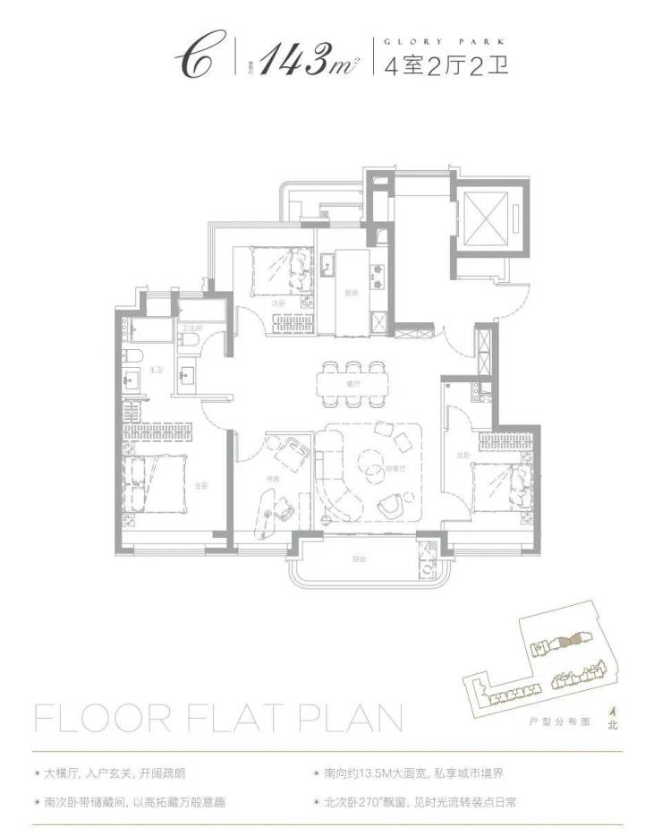 143㎡四房:宽境横厅设计,连接超大观景阳台,双主卧套房布局,适配三代同堂居住