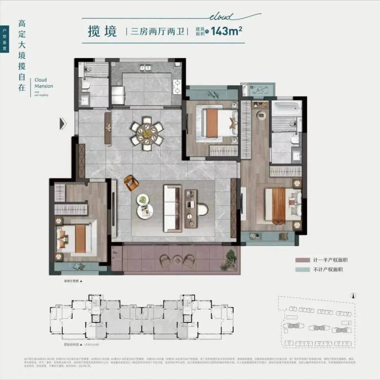 ·143㎡户型:3室2厅2卫(部分为4室),高品质改善户型,空间布局方正,南北通透,横厅设计叠加双面宽景观阳台,保证采光及通风效果。