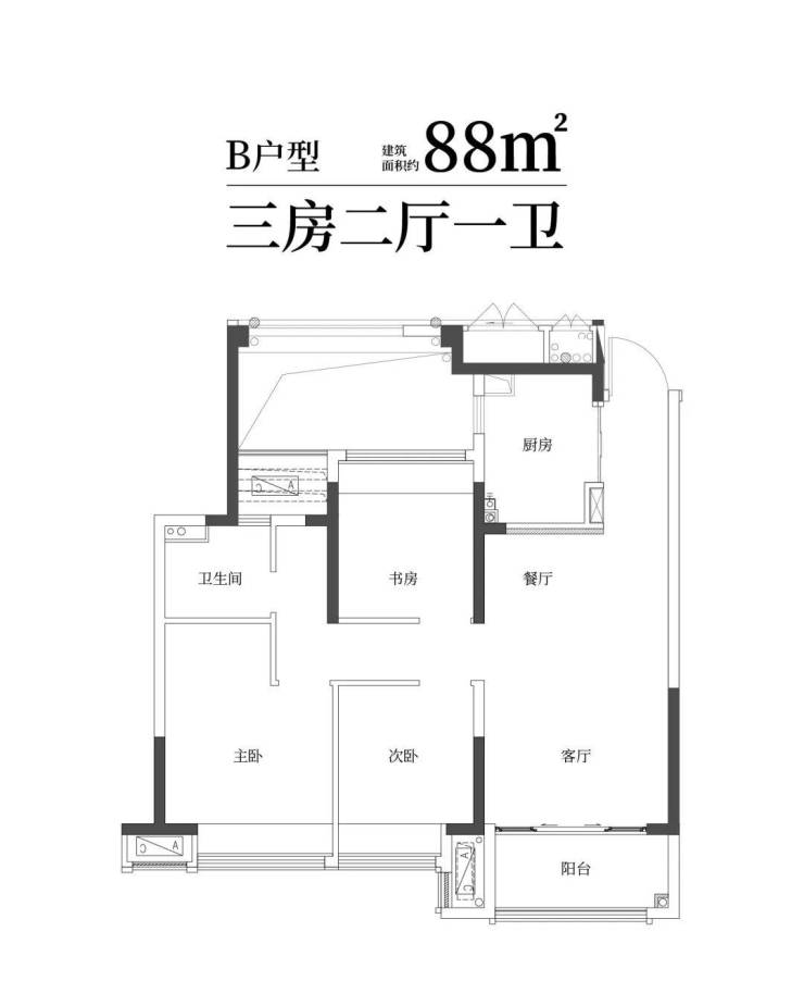 建筑面积约88㎡精雅三房一卫,三口之家理想;