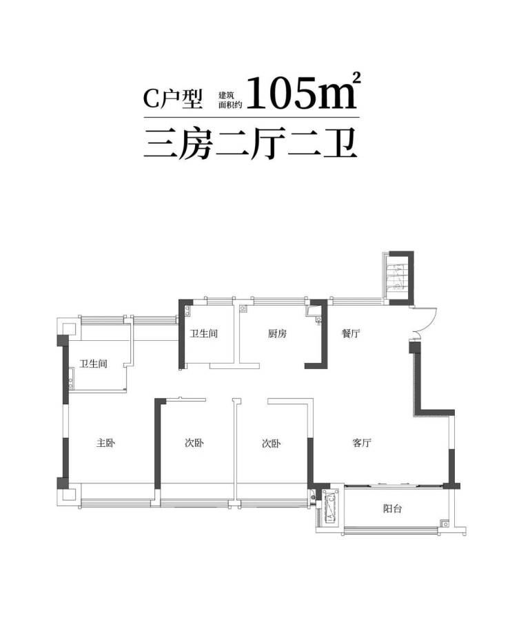 建筑面积约100㎡雅致三房两卫,满足二娃时代;