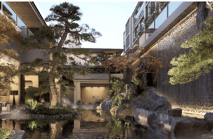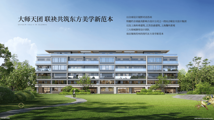 项目以苏州园林为灵感,打造"双轴七境五芳"景观。洋房采用四代宅设计,带有L形大露台;叠墅设计延展露台,外立面大面积玻璃