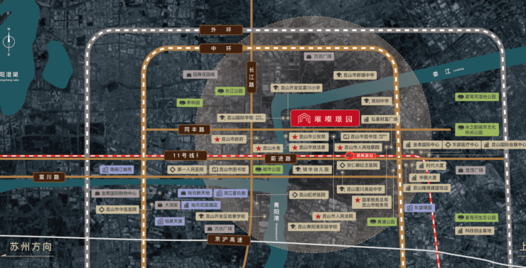 3公里内商圈:金鹰国际购物中心、万达广场、弘基财富广场、昆山商厦,满足高端消费与日常所需。