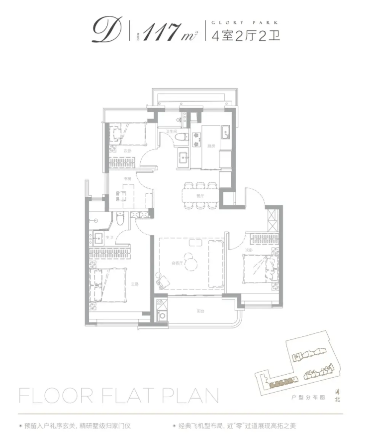 建面约 143㎡四房:四开间朝南,老人房与儿童房分置两端,主卧套房配备步入式衣帽间与观景飘窗,有可变空间。