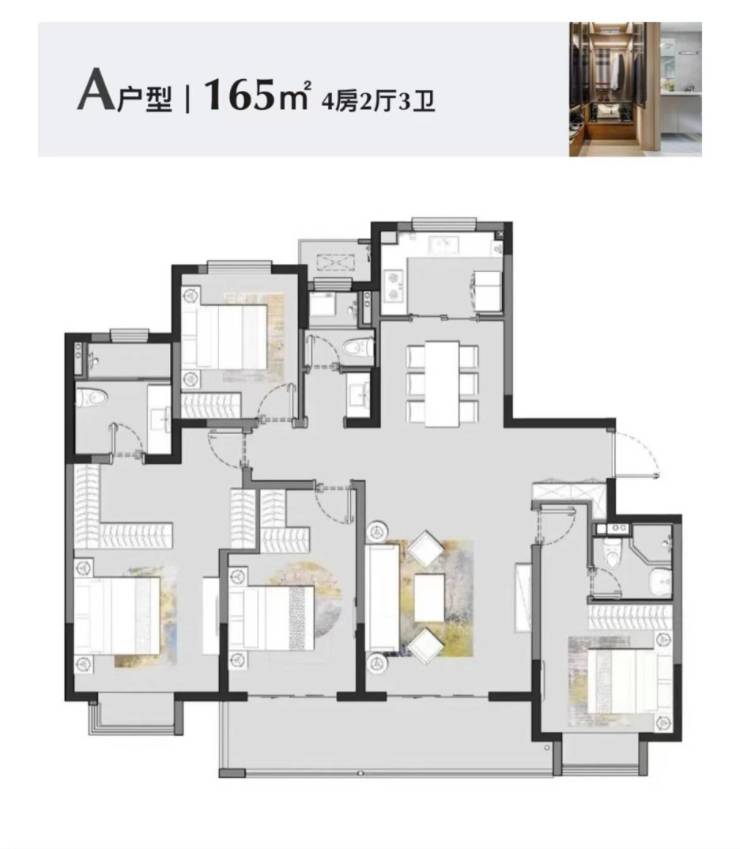 建面 165㎡4 居:分布于 69#、68#、70#,2 梯 2 户设计,总楼层 15F,层高 2.90 米,宽敞空间满足家庭聚会、亲友到访等多种需求。
