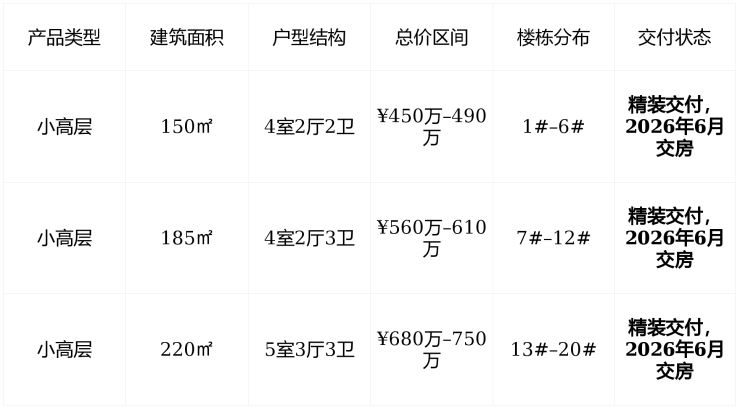 剩余房源 :截至2026年1月, 主力户型185㎡仍有余量 ,220㎡顶配户型仅剩5席,150㎡已售罄超80%