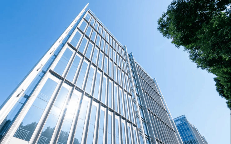 外立面:中空Low-E玻璃幕墙+银白色穿孔铝板,节能且具昭示性