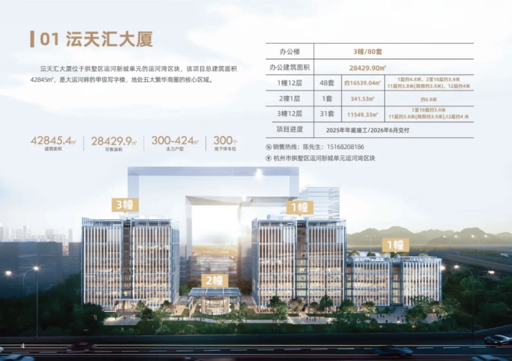 沄天汇大厦是位于杭州市拱墅区运河湾CBD核心区的国企开发实景准现房写字楼,主打约5000㎡整栋独栋总部空间,由杭州运河集团投资发展有限公司(国有全资)打造,定位为“运河畔总部封面”,是当前杭州主城稀缺的低密度企业总部资产,2025年底交付,即买即用。400 998 3632沄天汇大厦营销中心电话