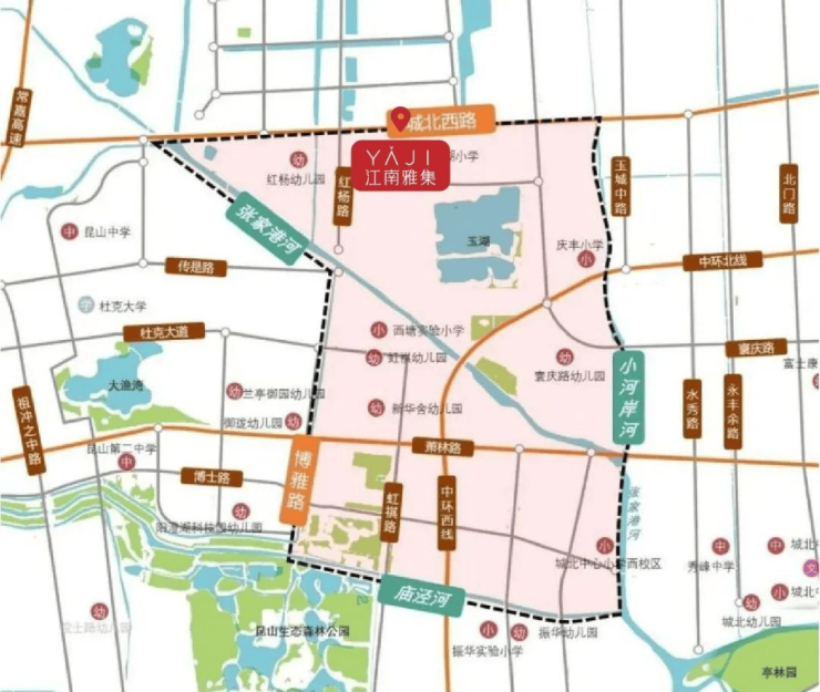 江南雅集作为昆山城西双湖板块的标杆项目,由昆山市东定置地有限公司(国企背景)开发,定位为改善型低密社区。 项目位于巴城镇东定路与东兴路交叉口,西侧600米即达500亩玉湖公园,东距中心湖公园1.8公里,坐拥"双湖生态"稀缺资源。