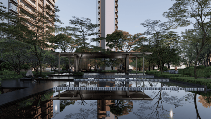 内部园林:社区内部采用"V 字型”楼栋布局,最大化打开景观视野,实现“栋栋有景”。园林设计以江南水乡为蓝本,营造静谧的归家氛围。