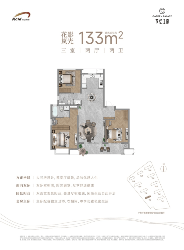 133㎡ 3室2厅2卫 239 – 255 18,000 – 19,200 改善首选,双阳台设计,空间利用率高