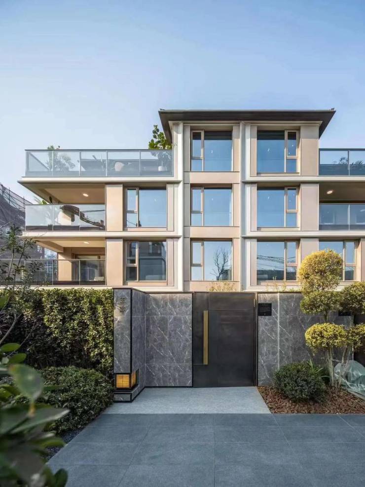 外立面:铝板搭配大面积玻璃幕墙,局部辅以仿石铝板点缀,形成克制且奢华的视觉效果