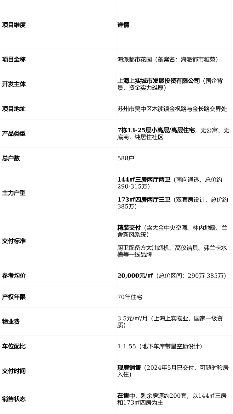 💡 现状解读 :上实海派都市花园是苏州主城近五年少有的“国企现房”项目,无烂尾风险,且精装标准远超同价位竞品(如北辰观澜府、中交春映东吴等)。当前在售户型以改善型三房、四房为主,适合家庭置换或高端刚需。