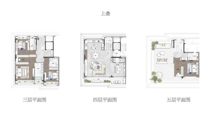 ※动静分区。上叠将起居层设计在三层和五层。这样既不会对下叠造成影响,也更保证了5F主卧套房的绝对独立。四层则作为会客厅,约16㎡露台通过移门延展视觉效果。