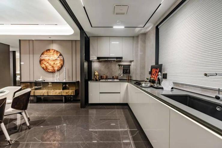 建面约228㎡实景细节如下:u型厨房,斯麦格灶具+蒸烤一体机+洗碗机+内嵌冰箱,还有天花吊顶、背景墙曲线,配有独立西厨岛台交付。