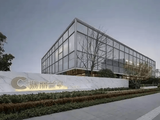 现代简约风格,花岗岩+铝板+玻璃幕墙,外立面质感高级,夜间“星光连廊”灯光如星河