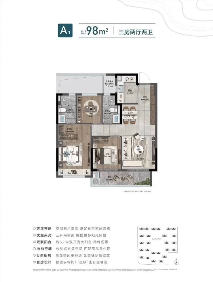 98㎡边套:约5.6米大飘窗,LDK一体化设计,U型厨房,双明卫干湿分离