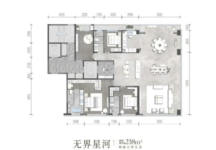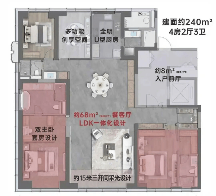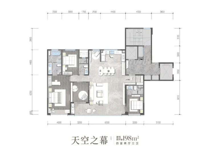 190㎡四房两厅三卫:创新性实现"四室舒适度",南向总面宽15米,客厅开间+阳台达7.7米,主卧套房约36㎡带270°环幕飘窗3
