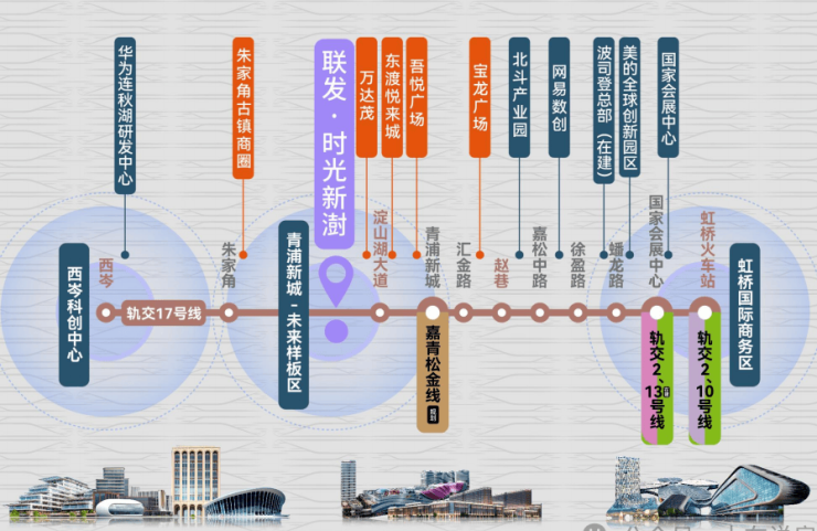 轨交17号线,串联起了 天空万科广场所在的徐盈路站、蟠龙天地所在的蟠龙路站、国家会展中心所在的诸光路站以及虹桥交通枢纽所在的虹桥火车站。同时,17号线还能在虹桥无缝换乘2号线