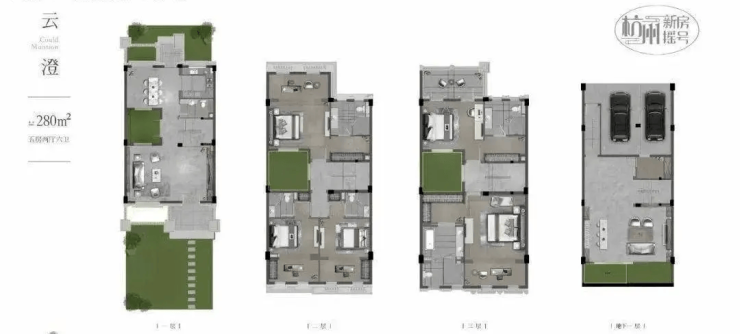 280㎡ 880万–1150万元 约39,300元/㎡ 四联排中间套,5室2厅6卫,庭院约180㎡ 性价比之选,主力成交户型