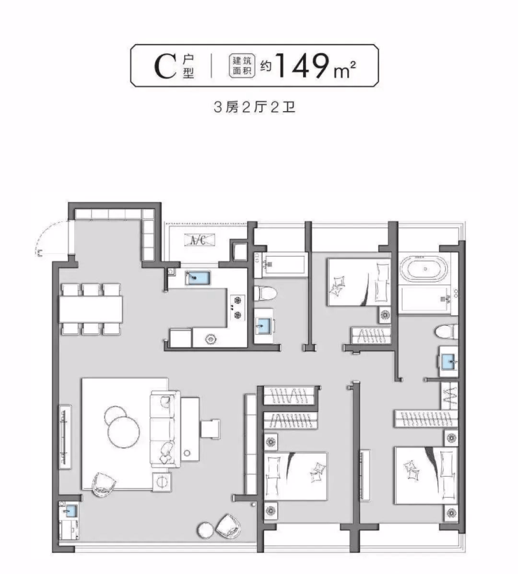 湖景视野:主力户型105–151㎡,全系南北通透,客厅与阳台一体化设计,最大面宽近7米,推窗见双湖景致。