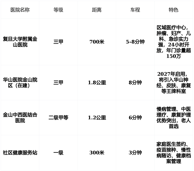 健康保障1公里内覆盖“三甲+三甲(在建)+二级+社区”四级医疗体系无新建医院规划,但现有资源已全面超越郊区盘标准老人慢病、儿童疫苗、突发急症,全部无忧